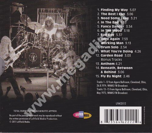 ABSOLUTNA REWELACJA!!! Wielokrotnie bootlegowany, a teraz po raz pierwszy wydany oficjalnie, RADIOWY i autentycznie znakomity koncert z sierpnia 1974 roku (a więc niespełna pół roku po płytowym debiucie Kanadyjczyków) - zarejestrowany w 2 tygodnie po przyjściu do grupy perkusisty Neila Pearta (zastąpił Johna Rutseya)! Zespół był w znakomitej formie i zaprezentował doskonałe, ciężkie wersje większości nagrań z "jedynki" (sześć z ośmiu) oraz m.in. Best I Can i In the End - oba z niewydanego jeszcze, drugiego albumu! Co ważne, CD ZAWIERA 3 KOMPOZYCJE NIEPUBLIKOWANE NA ŻADNYM ALBUMIE GRUPY (przeróbkę Bad Boy z repertuaru The Beatles oraz 2 kawałki własne)! Co ważne, jakość dźwięku jest idealna! Dodatkowo zamieszczono tutaj 3 nagrania (już nieco gorszej jakości) zarejestrowane w tym samym miejscu ale rok później - w maju 1975 roku (wszystkie z wydanego kilka miesięcy wcześniej LP Fly By Night). W sumie otrzymaliśmy 68 minut potężnego, gitarowego grania w trio. Jest to ogromna niespodzianka i zdecydowanie wspaniała gratka dla fanów Rush oraz płyta niezbędna każdemu miłośnikowi klasycznego hardrockowego grania z pod znaku Led Zeppelin, Budgie, Thin Lizzy oraz Black Sabbath! Mus! Stan: zafoliowana