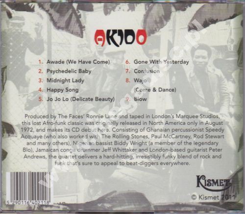 UWAGA! Kraj pochodzenia tego zespołu został przeze mnie określony jako Nigeria ze względu na grającego tutaj basistę Biddy Wrighta znanego ze świetnej formacji Blo! W rzeczywistości Akido to międzynarodowa supergrupa, w składzie której znaleźli się obok Wrighta, grający na perkusji, pochodzący z Ghany Speedy Acquaye (współpracujący m.in. z Rolling Stones, Paulem McCartneyem i Rodem Stewartem) grający na kongach Jeff Whittaker z Jamajki oraz gitarzysta Peter Andrew z Londynu... Muzycznie jest to trochę funkujący afro-rock z fajnymi partiami elektrycznej, chwilami nawet bluesującej gitary. Płyta została nagrana w 1972 roku w Londynie zaś producentem całości był Ronnie Lane z Faces! Stan: zafoliowana