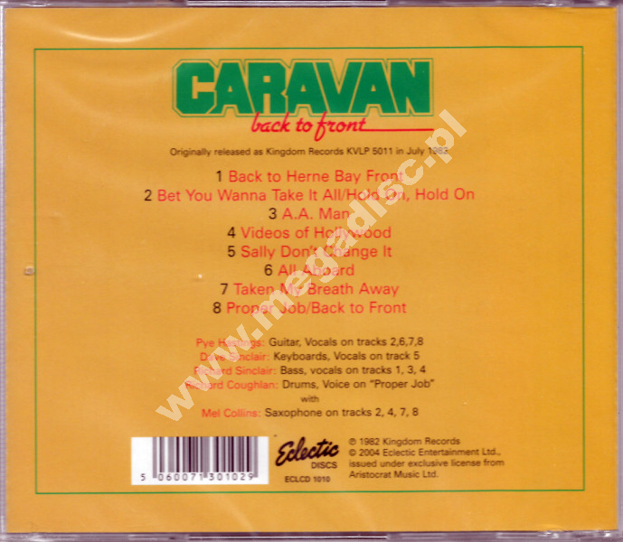 Album z 1982 roku, który pokazuje Caravan w późniejszym, bardziej uporządkowanym etapie kariery – już mniej „odjechanym”, ale nadal wyraźnie zakorzenionym w klimacie Canterbury scene. „Back to Front” brzmi bardziej przystępnie niż klasyczne płyty zespołu, z wyraźnym skrętem w stronę melodyjnego prog rocka. Muzycznie to materiał spokojniejszy, elegancki i nostalgiczny, nie ma tu już takiej improwizacyjnej swobody jak w latach 70., ale wciąż słychać typową dla zespołu lekkość i inteligentne aranżacje. Bardzo rzadkie na rynku wydanie z 2004 roku. TYLKO JEDNA SZTUKA! Nowa, zafoliowana.