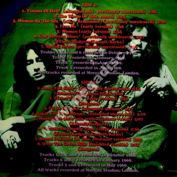 Rewelacyjny, limitowany dwupłytowy winyl wytwórni Verne, gromadzący rzadkie i niepublikowane nagrania studyjne zarejestrowane w klasycznym składzie (z Andym Fraserem i Paulem Kossoffem) w latach 1968-1972, czyli w okresie pierwszych pięciu albumów, aczkolwiek niemal wszystkie utwory powstały w czasie najwcześniejszych i najlepszych trzech albumów. Jakość dźwięku jest rewelacyjna! Proszę również spojrzeć na wydany w tym samym czasie i przez tę samą wytwórnię, podwójny LP "Free In Concert", będący jakby bardzo rozszerzoną, alternatywną wersją klasycznego "Free Live"! Mus! Stan: NOWA, niezafoliowana.