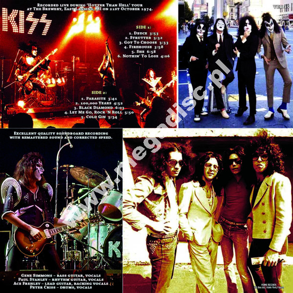 Wydany w bardzo atrakcyjnej, laminowanej okładce świetny, ponad 50-minutowy koncert Kiss (11 nagrań), zarejestrowany w październiku 1974 podczas trasy promującej LP "Hotter Than Hell"! Uwaga! Po raz pierwszy ten materiał brzmi odpowiednio - z poprawioną (szybszą) prędkością przesuwu taśmy! Wszystkie wcześniejsze wersje na winylu i na CD brzmiały zdecydowanie za wolno - co doskonale słychać na wersjach na YouTube! Ta zremasterowana i zdecydowanie lepsza edycja posiada znacznie więcej wysokich tonów i brzmi niemal doskonale! Edycja na niebieskim winylu. Stan: MINT (NOWA, niezafoliowana). (JL)