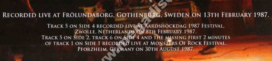 Limitowana do 500 egzemplarzy, na dwóch czarnych winylach, francuska pełna edycja (wraz z solówkami na basie i gitarze - pominiętymi na trwającej 80 minut wersji CD Top Gear) 90-minutowego, kapitalnego występu Metalliki ze szwedzkiego Goteborga, z 13 lutego 1987 roku. Dodatkowo zamieszczono trzy rzadkie nagrania świetnej jakości z trasy "Garage EP" ("Leper Messiah", "Blitzkrieg" i "Last Caress")! Ten koncert odbył się trzy dni po występie grupy w Katowicach - podsumowywał pierwszą europejską trasę z nowym wówczas basistą Jasonem Newstedem! O ile katowicki występ istnieje na bootlegach w fatalnej jakości dźwieku, to Goteborg został transmitowany przez radio i w mojej ocenie obok Seattle 1989 (z oficjalnego boksu "Live Shit & Binge") jest to najlepszy i najlepiej nagrany koncert Metalliki z całych lat 80-tych!!! Jakość dźwięku jest niemal idealna, zestaw nagrań pochodzi z pierwszych trzech albumów i jest jak marzenie! Zespół zagrał solidnie, czysto i nieco ostrzej niż na płytach, a wciąż selektywnie! Poza tym była to ostatnia trasa kiedy James Hetfield śpiewał w wyższej tonacji - już dwa lata potem zaczął oszczędzać głos... Kapitalna, laminowana okładka i bardzo dobra jakość dźwięku! Stan: NOWA, niezafoliowana. To jest absolutny mus dla wszystkich fanów ciężkiego grania! (JL)