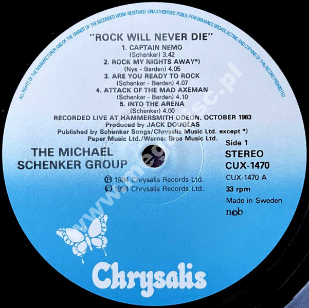 MICHAEL SCHENKER GROUP - Rock Will Never Die - Live! - SWEDISH Chrysalis 1984 1st Press - NEAR MINT VINTAGE VINYL