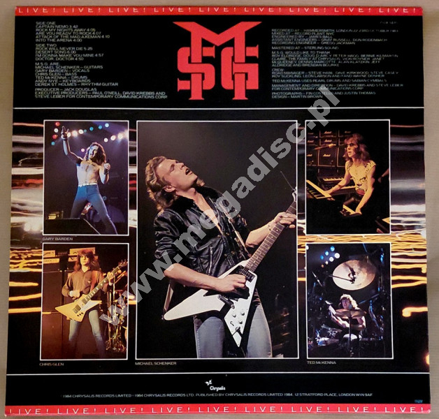 ANALOGOWE BRZMIENIE! Bardzo rzadkie, pierwsze szwedzkie wydanie (z 1984 roku) koncertowego albumu zarejestrowanego w hali Hammersmith Odeon w Londynie, w październiku 1983. Był to drugi live w dyskografii grupy prowadzonej przez niemieckiego gitarzystę. W ostatnim utworze, "Doctor Doctor" z repertuaru Scorpions, pojawiają się członkowie tego zespołu, wokalista Klaus Meine i brat Michaela, gitarzysta Rudolf Schenker. Okładka: EXCELLENT / Płyta prawdopodobnie niegrana: MINT(-)
