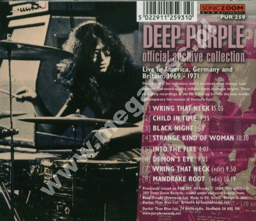 Wydana przez Purple Records, brytyjska kompilacja rzadkich koncertowych nagrań (w tym z rzadkich bootlegów) oraz występów telewizyjnych najsłynniejszego, drugiego składu z Gillanrm i Gloverem. Zwraca uwagę zwłaszcza doskonale nagrany Wring That Neck (sierpień 1969) z Amsterdamu a także alternatywna, studyjna wersja Black Night. Warto posiadać ten CD choćby ze względu na pochodzącą z 1971 roku, nagraną podczas trasy po Ameryce i trwającą 9 minut, koncertową wersję Demon's Eye - utworu, który bardzo rzadko wykonywany był przez zespół na żywo. Bardzo dobra choć nie zawsze idealna jakość dźwięku (pół na pół). Dodatkowo bardzo atrakcyjny booklet z mnóstwem ciekawych zdjęć i opisów. Absolutny mus dla fanów Deep Purple! TYLKO JEDNA SZTUKA! Nowa, zafoliowana.