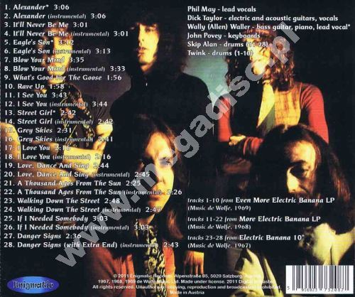 Poszerzona o instrumentalne nagrania i trwająca równo 80 minut edycja najlepszego (obok S.F. Sorrow z 1968) materiału jaki kiedykolwiek nagrała grupa The Pretty Things! To jest długa historia, więc pokrótce... W latach 1967-1969 nigdy nienarzekająca na nadmiar gotówki grupa nagrała serię płyt (jedną 10-calówkę - wraz z nagraniami innych wykonawców oraz dwa albumy) dla będącej biblioteką muzyczną wytwórni de Wolfe. Na pierwszych stronach monofonicznych winyli umieszczone wersje z wokalem, zaś na drugich - wyłącznie ścieżki instrumentalne. Potem te nagrania pojawiały się jako ilustracja muzyczna w programach telewizyjnych, niskobudżetowych, brytyjskich filmach itd. W każdym razie wszystkie te płyty nigdy nie trafiły do sprzedaży (obecnie są bardzo poszukiwane) a na dodatek wydane zostały pod szyldem Electric Banana (prawdziwa nazwa zespołu nigdy nie padła)... Nietrudno zgadnąć, że zespół był wówczas u szczytu formy, zaś takie kawałki jak Alexander, Eagle's Son czy Blow Your Mind (z LP Even More Electric Banana z 1969) przebijają nawet legendarny S.F. Sorrow! Jak już wspomniałem, (przemieszane z wersjami wokalnymi) instrumentalne ścieżki pojawiły się na CD po raz pierwszy i jest to najlepiej brzmiąca i najpełniejsza edycja "Electric Banana" kiedykolwiek wydana! Napisać "absolutny mus" - to za mało!