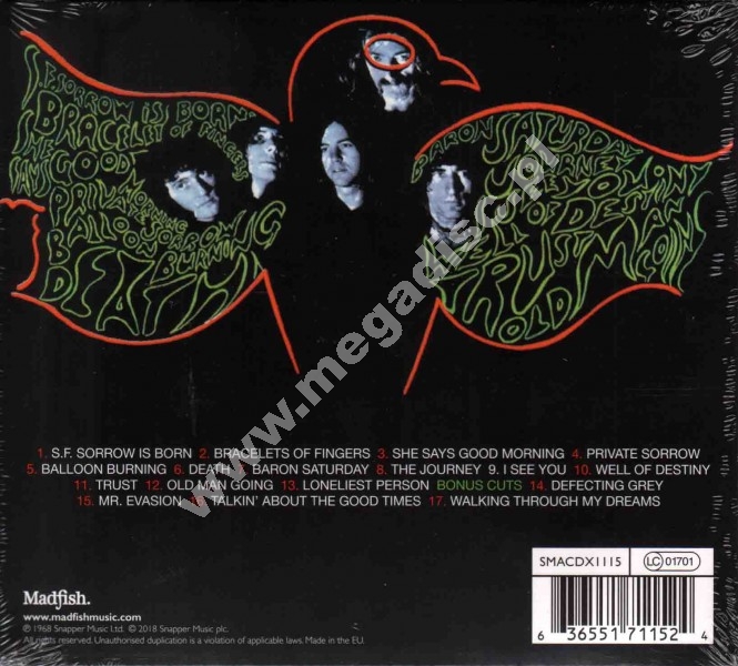 Z pełną odpowiedzialnością stwierdzam, że wydany w listopadzie 1968 roku LP "S.F. Sorrow" to jedna z pięciu najlepszych (i zarazem najbardziej niedocenionych) płyt w HISTORII ROCKA!!! Komu mogę, to wszczepiam wirusa "S.F. Sorrow" - kwintesencji psychodelicznego i zarazem pełnego niesamowitych emocji rocka... Obok albumu, na CD umieszczono cztery nagrania z obłędnych, psychodelicznych singli! MUS!!!