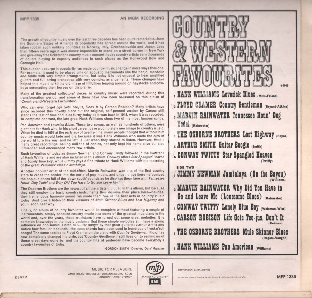 Brytyjska kompilacja z 1965 roku, zawierająca nagrania gwiazd country. Laminowana okładka w prawie idealnym stanie.